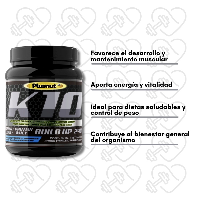 K10 es un suplemento en polvo con una combinación efectiva de proteína vegetal (soya), proteína animal (suero de leche) y un complejo de vitaminas y minerales. Esta fórmula está diseñada para quienes buscan un impulso completo de fuerza, energía y nutrición en cada toma.