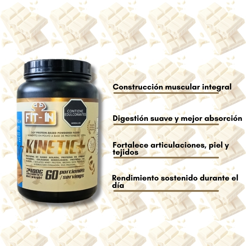 KINETIC+ es una proteína avanzada que combina lo mejor de fuentes animales y vegetales para un rendimiento superior. Su fórmula única con whey aislado, arroz integral, colágeno y proteína de huevo ayuda a construir músculo, recuperar el cuerpo y mejorar tu bienestar general.